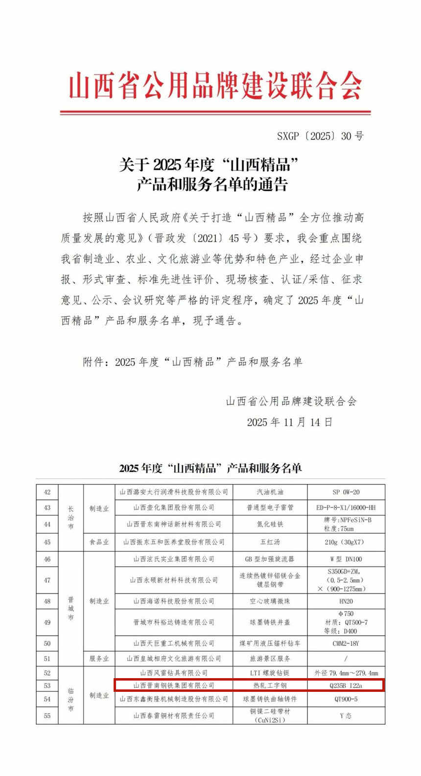 11月17日,山西省公用品牌建设联合会通告2025年度“山西精品”产品和服务名单,晋南钢铁集团热轧工字钢成功入选。这一荣誉的取得,不仅标志着集团产品品质和技术创新能力获得权威认可,更成为集团积极贯彻省委、省政府打造“山西精品”公用品牌,全方位推动高质量发展战略的实践成果。