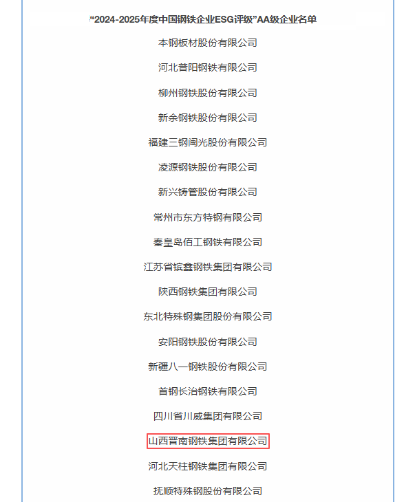 “2024-2025年度中国钢铁企业ESG评级AA级企业”名单
