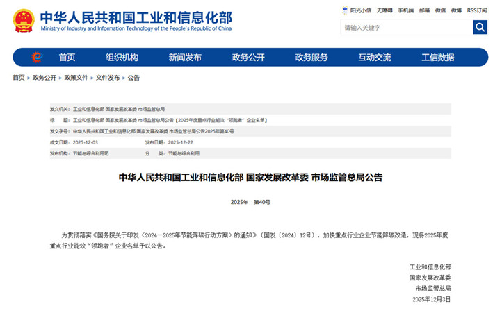 近日,工业和信息化部、国家发展改革委、市场监管总局联合发布《2025年度重点行业能效 “领跑者”企业名单》,集团旗下立恒焦化凭借卓越的能效水平、系统的节能举措与坚定的绿色转型决心成功入选,成为焦化行业唯一上榜企业,彰显出集团在节能降碳领域的硬核实力。