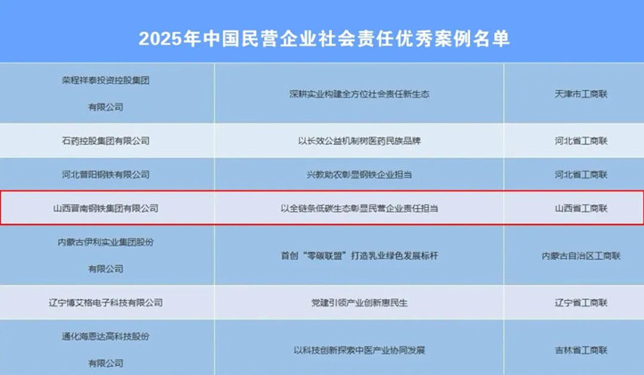 12月23日,全国工商联在湖南长沙举办的十三届四次执委会议上发布《中国民营企业社会责任报告(2025)》,并公布2025年中国民营企业社会责任优秀案例名单,晋南钢铁集团“以全链条低碳生态彰显民营企业责任担当”案例成功入选,成为山西省唯一入选民营企业。