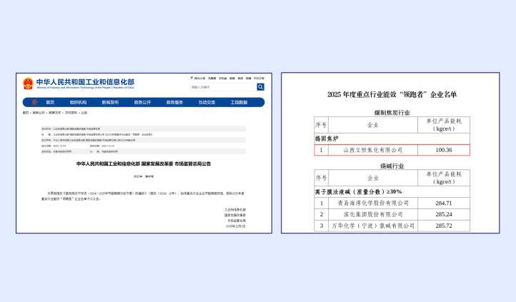2025年12月3日,工业和信息化部、国家发展改革委、市场监管总局联合发布《2025年度重点行业能效“领跑者”企业名单》,集团旗下立恒焦化凭借卓越的能效水平、系统的节能举措与坚定的绿色转型决心成功入选,成为焦化行业唯一上榜企业,彰显出集团在节能降碳领域的硬核实力。