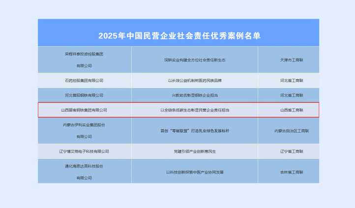 2025年12月23日,全国工商联在湖南长沙举办的十三届四次执委会议上发布《中国民营企业社会责任报告(2025)》,并公布2025年中国民营企业社会责任优秀案例名单,集团“以全链条低碳生态彰显民营企业责任担当”案例成功入选,成为山西省唯一入选民营企业。
