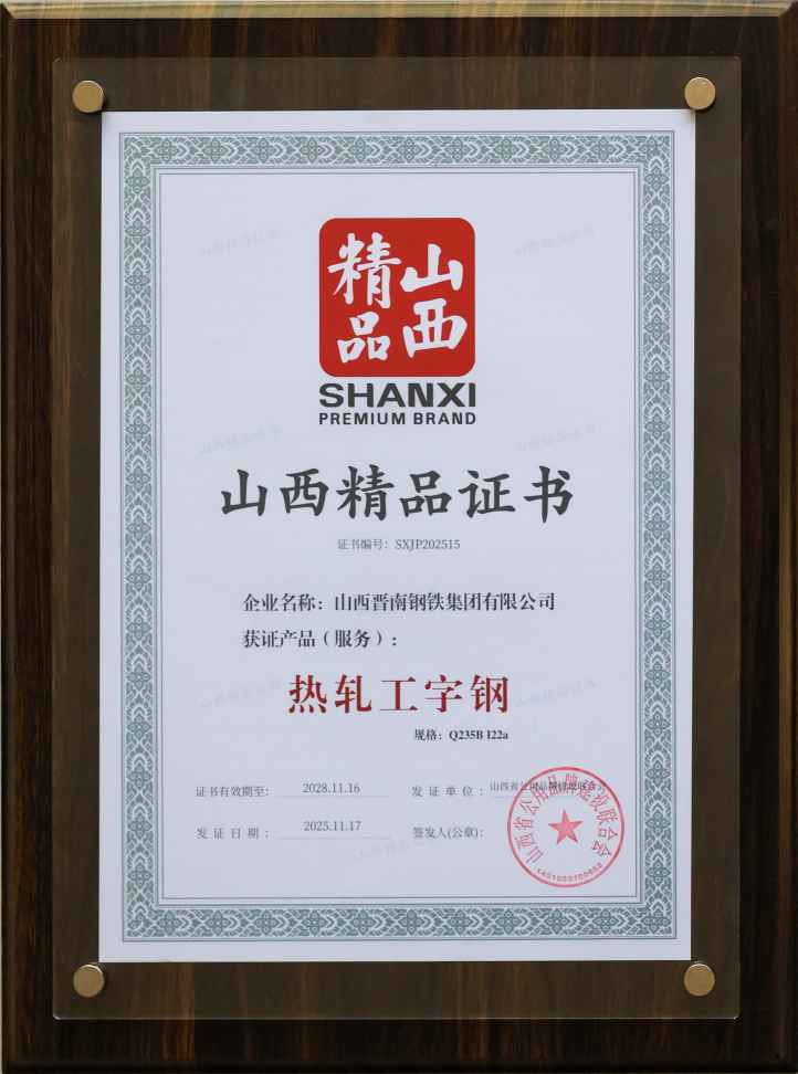2025年11月17日,集团热轧工字钢Q235B、I22a荣获2025年度“山西精品”。这一荣誉的取得,不仅标志着集团产品品质和技术创新能力获得权威认可,更成为集团积极贯彻省委、省政府打造“山西精品”公用品牌,全方位推动高质量发展战略的实践成果。
